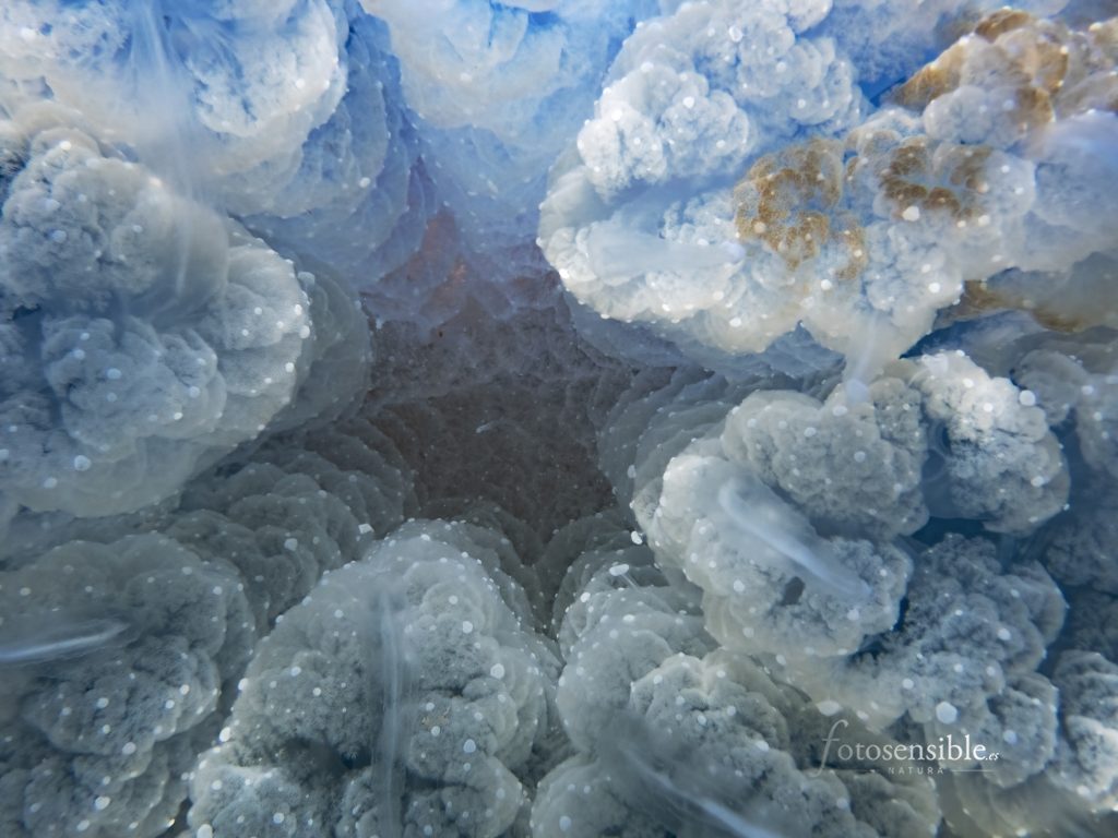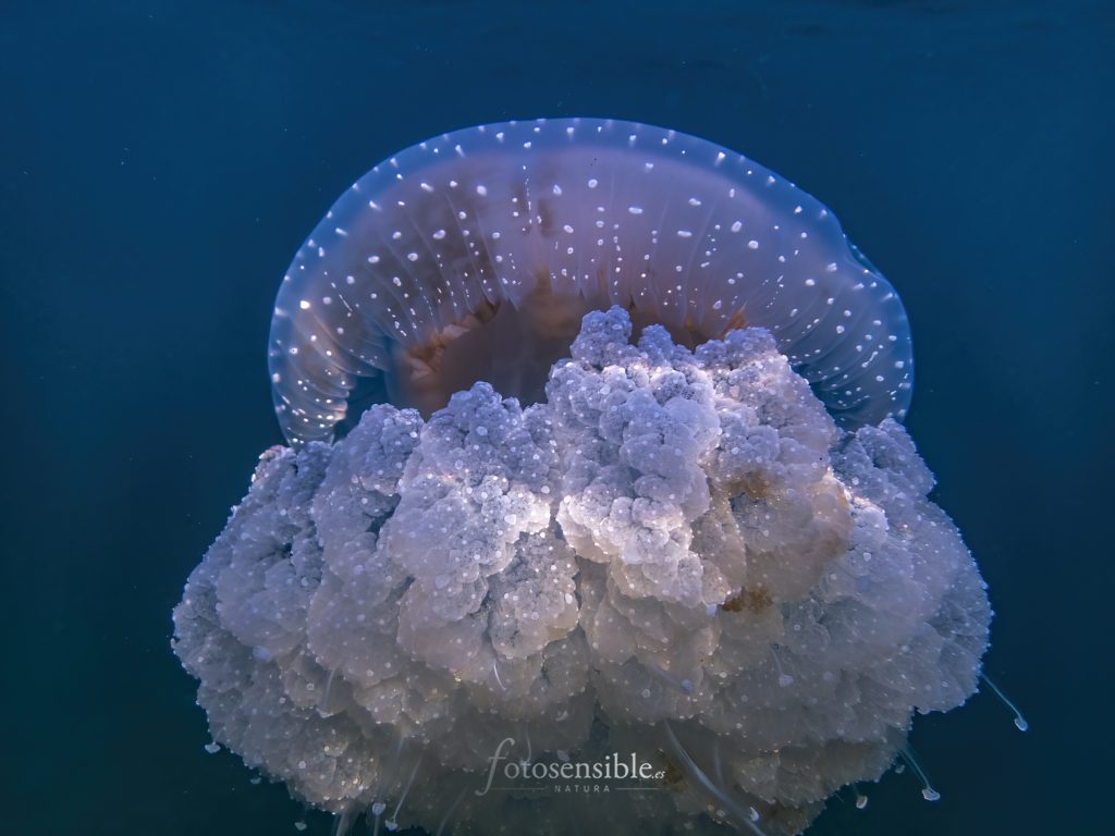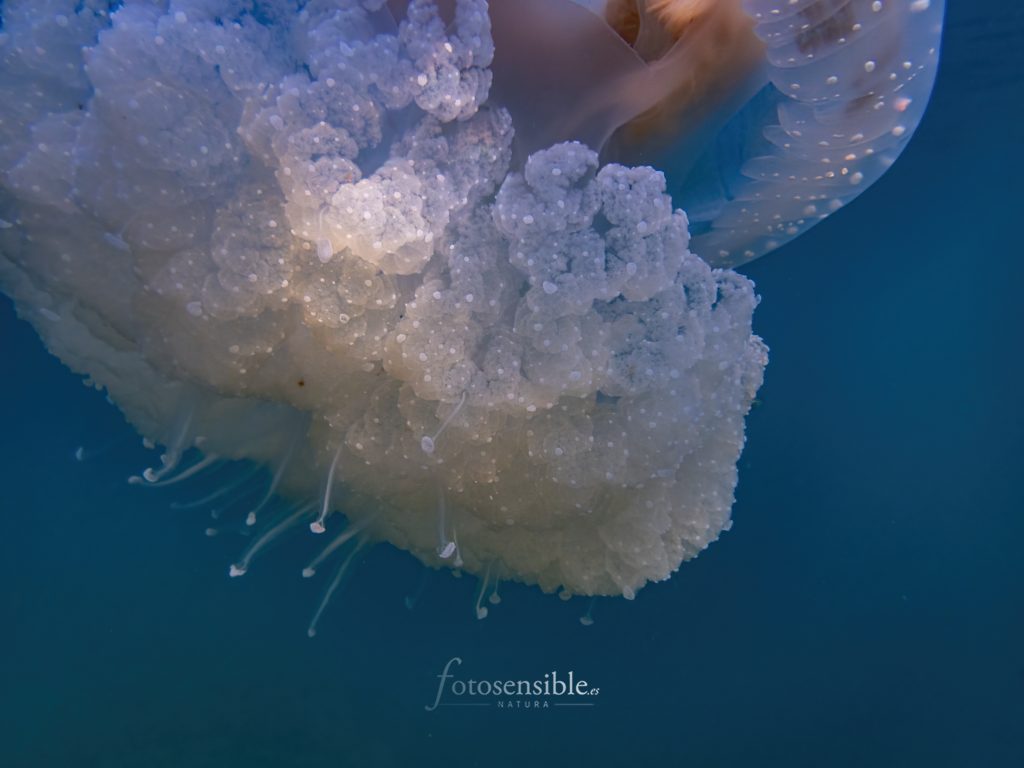 En el caso de esta bella medusa, —que no es letal para los humanos, aunque sí muy molesta con solo rozar sus tentáculos armados de “cnidocitos” que se clavan en la piel como mini-arpones urticantes—, parece ser que puede llegar a alimentarse del plancton que filtra, pero también de huevos de artrópodos como cangrejos y camarones.