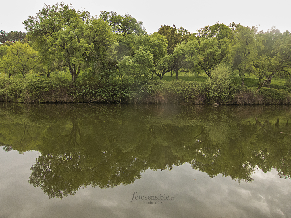 Sentado en una roca en la ribera del río, contemplando el reflejo de los árboles y arbustos de la otra orilla, mientras esperamos que los tímidos galápagos se asomen a respirar a la superficie (“a la fauna hay que esperarla”). Media tarde nublada, la brisa trae olor a jara y a hierba mojada.