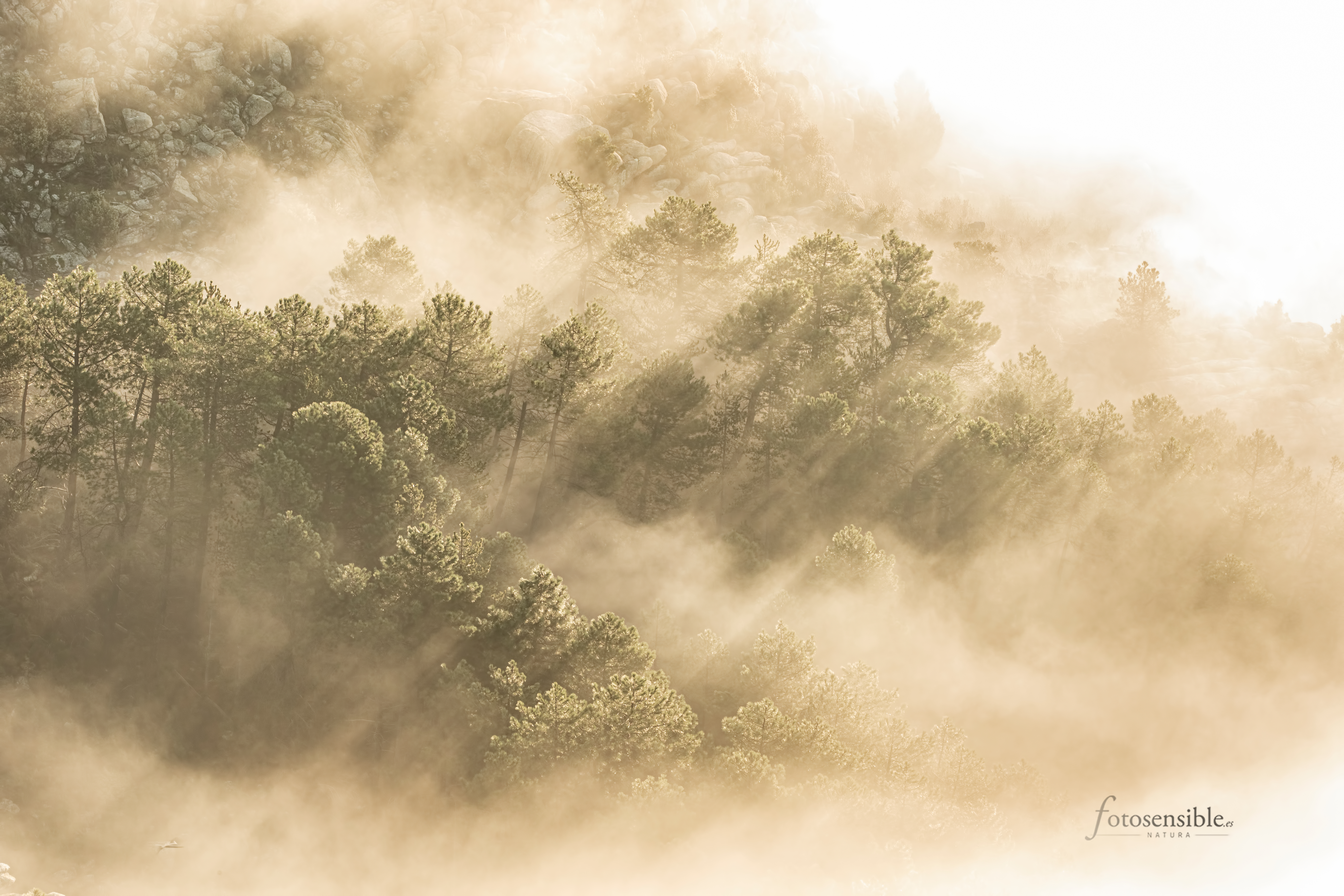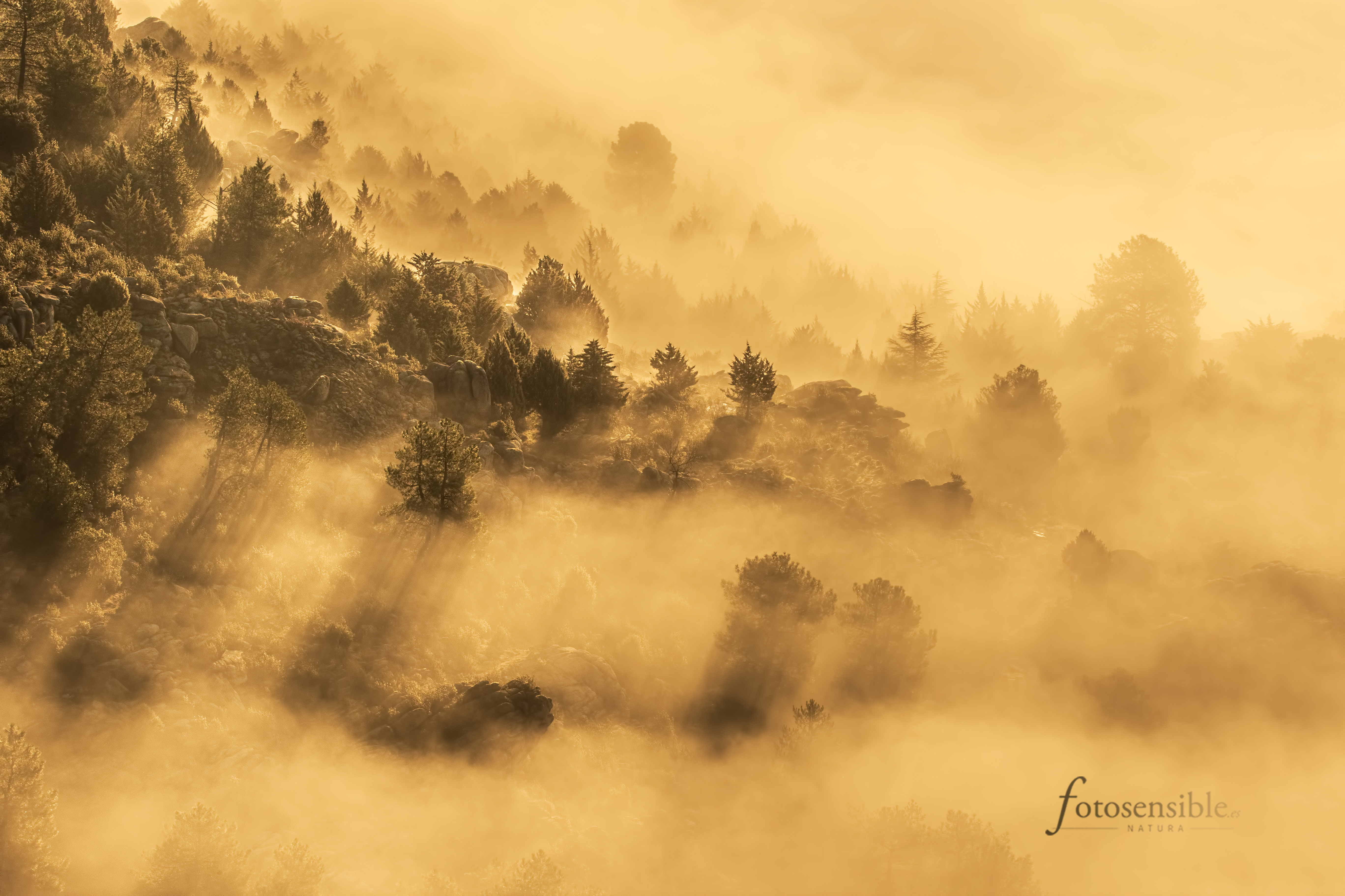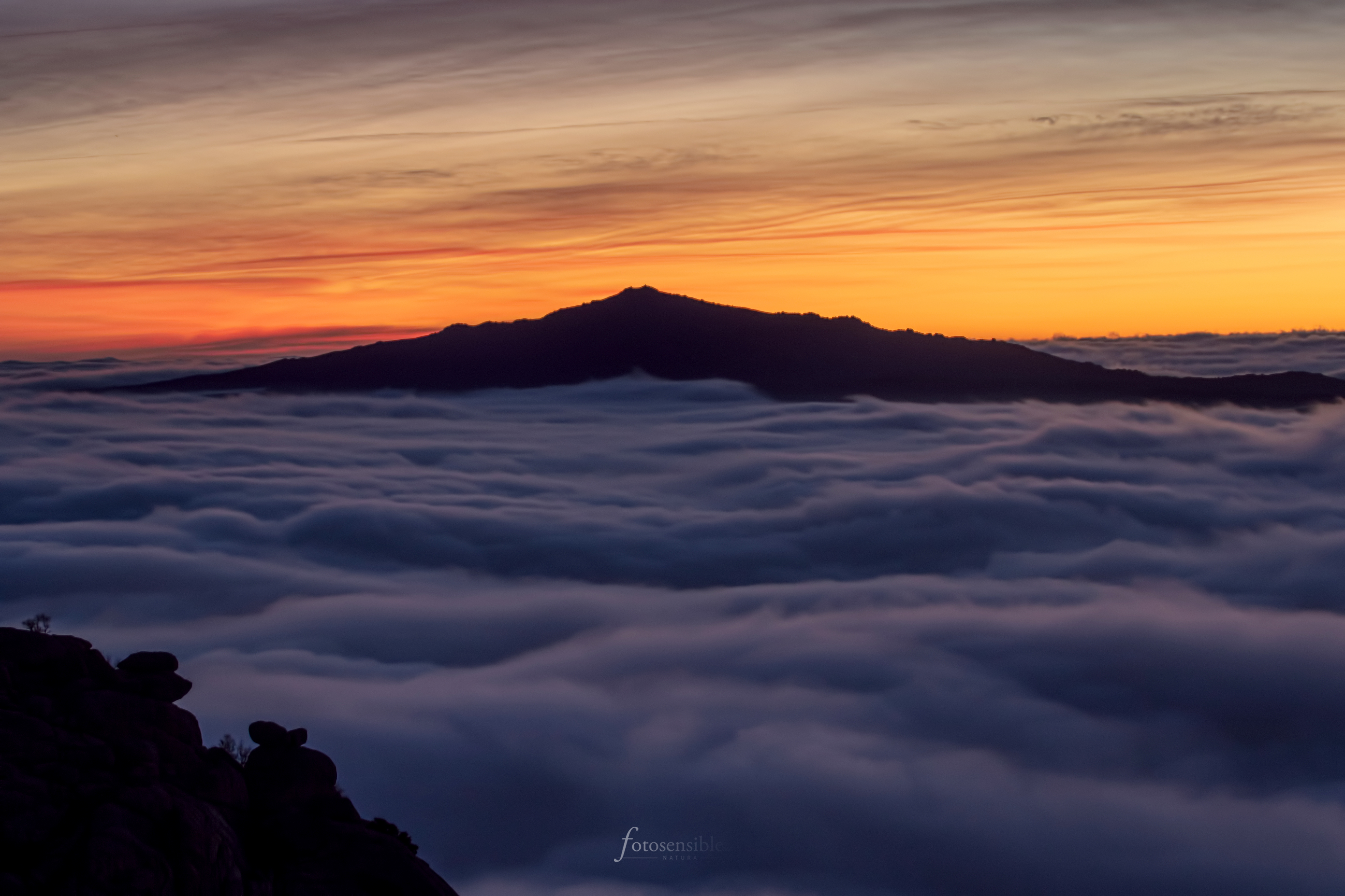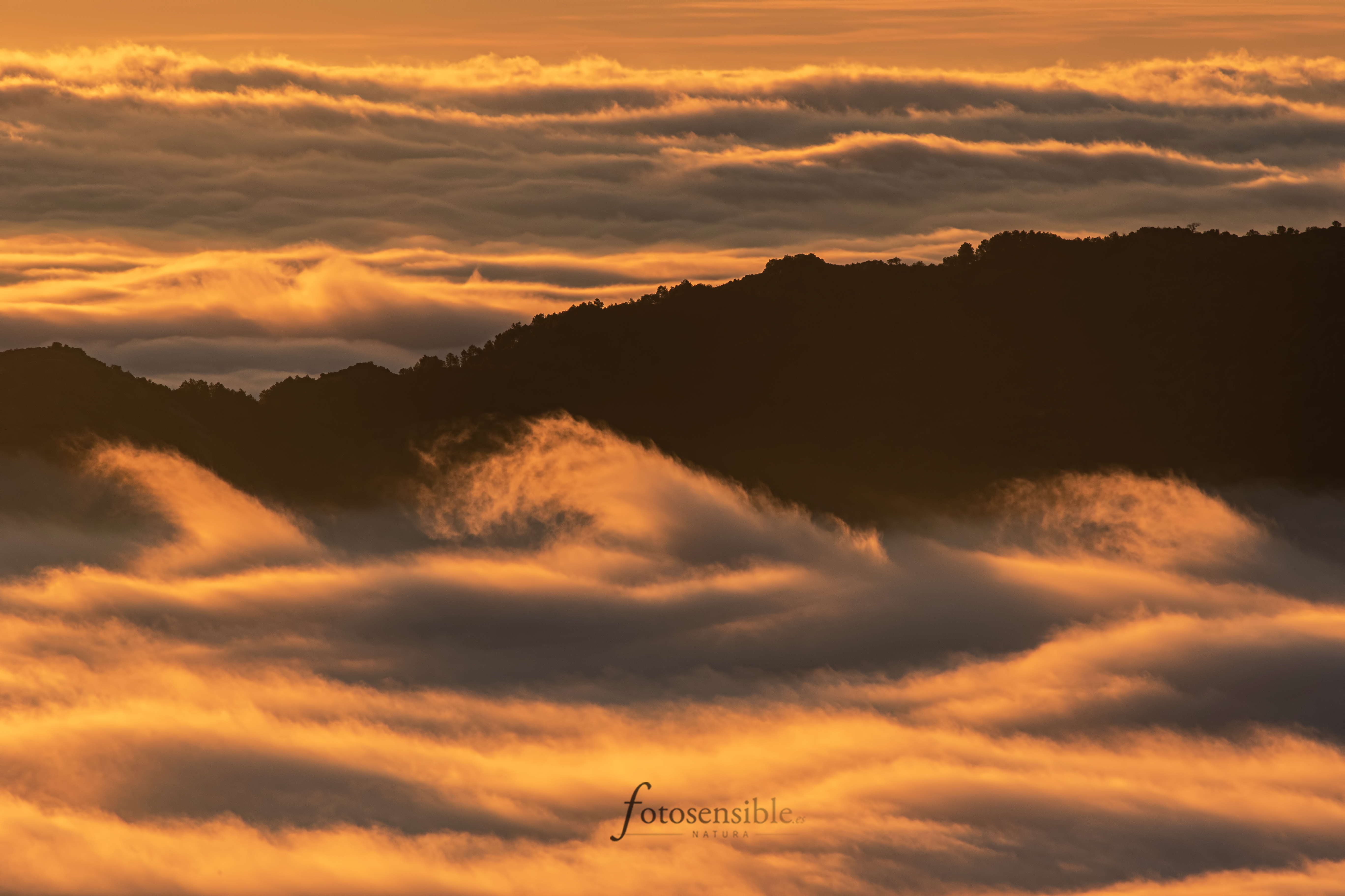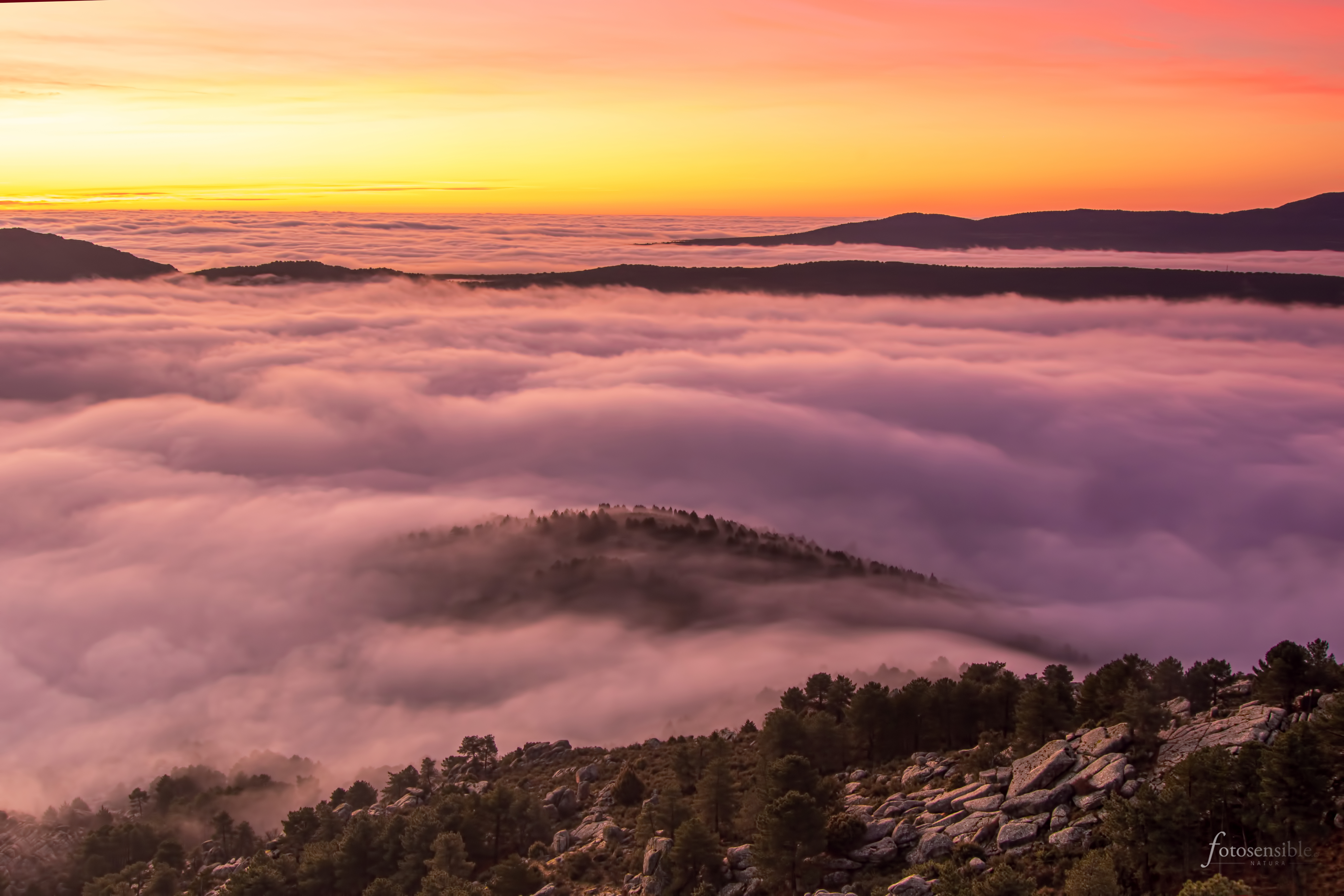 El amanecer es probablemente el mejor momento del día. Durante una hora aproximadamente, el mundo sale de las sombras y la luz empieza a acariciar todas las formas que encuentra a su paso. Tenue y tímidamente, durante esa hora el mundo va despertando envuelto en un ambiente mágico. Este ambiente adquiere tintes espectaculares cuando además se sumerge en un mar de nubes.