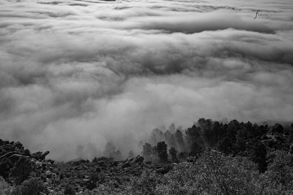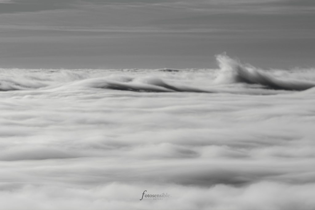 Cuando bajas de la montaña y te adentras en el mar de nubes, ya no puedes verlo, solo sentir su presencia a tu alrededor. Todo parece un sueño, difuminado, disperso, incoloro… pero igualmente mágico.